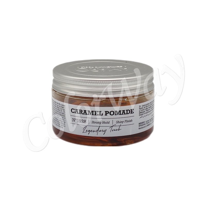 Caramel pomade. Hold: strong. Finish: medium high shine. Water-based pomade great for controlling and defining pomps, side-parts and slick-backs.